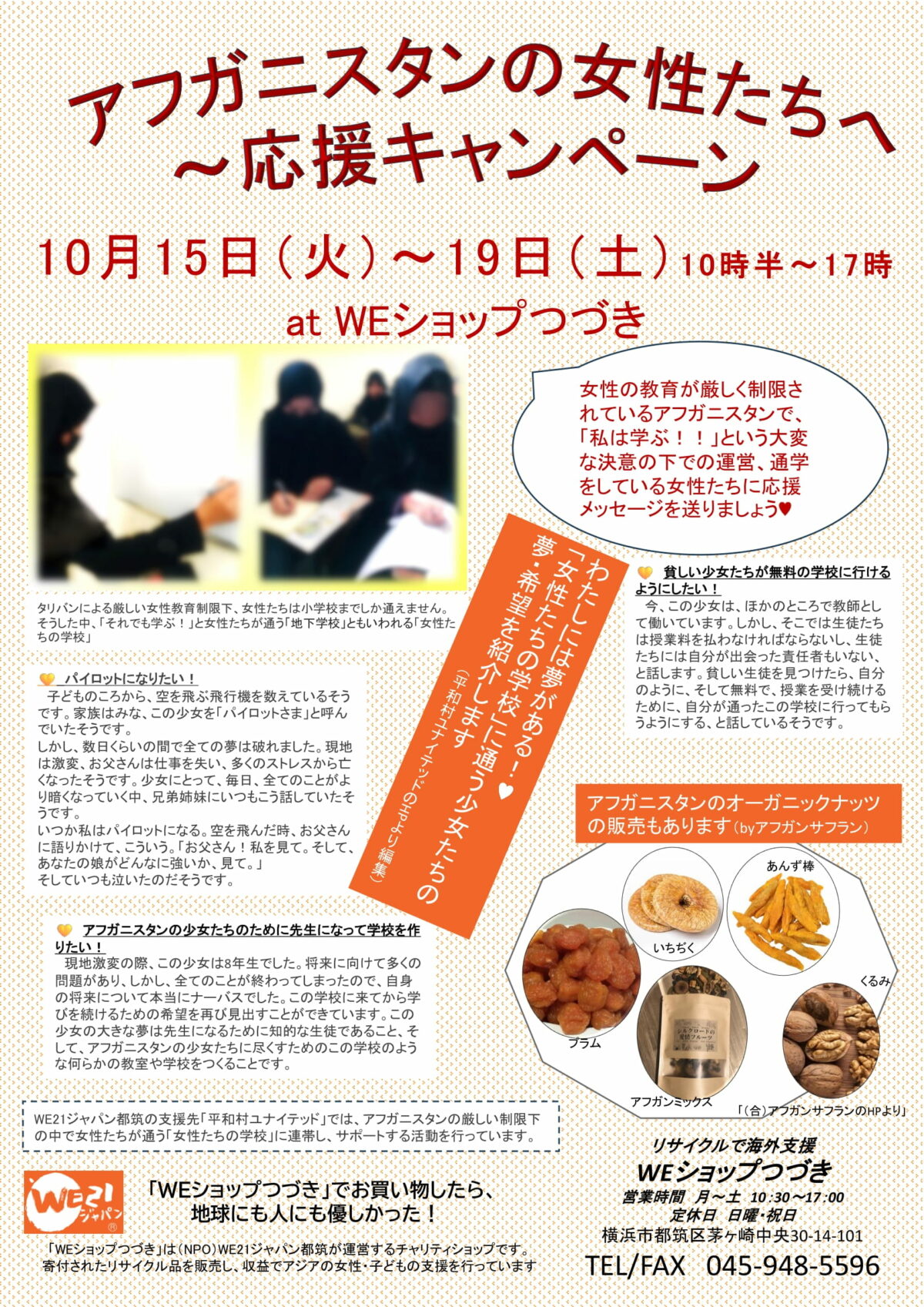 「WE21ジャパン都筑の支援先『平和村ユナイテッド』は、タリバンの厳しい制限化の中で女性たちへが通う『女性たちの学校』に連帯し、サポートする活動を行っています。この活動内容をショップ店内でパネル展示し来店されたお客様から応援メッセージをいただきます。また通常では販売していないアフガニスタンのナッツやドライフルーツを販売します。」(WEショップつづき)