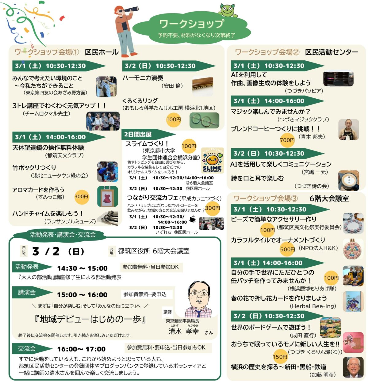 「都筑区で自分もなにか活動してみたい」と地域活動に興味のある方にもおすすめですが、大人も子どもも楽しめるワークショップの開催もあり、誰もが気軽に楽しむことのできるイベントです。