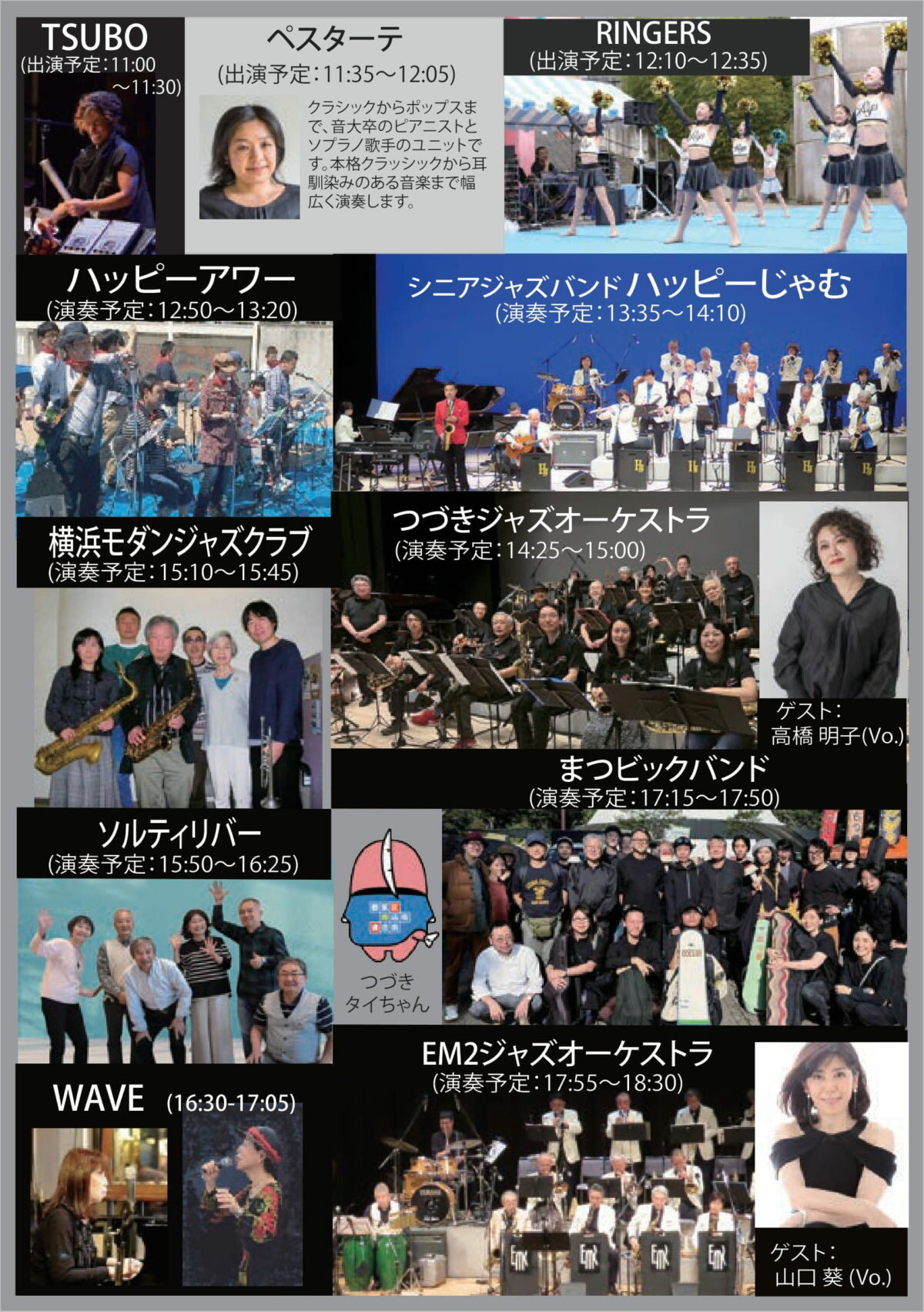 ジャズバンドを中心に11団体がステージを盛り上げます。都筑区のゆるきゃら「つづきタイちゃん」も登場予定です。