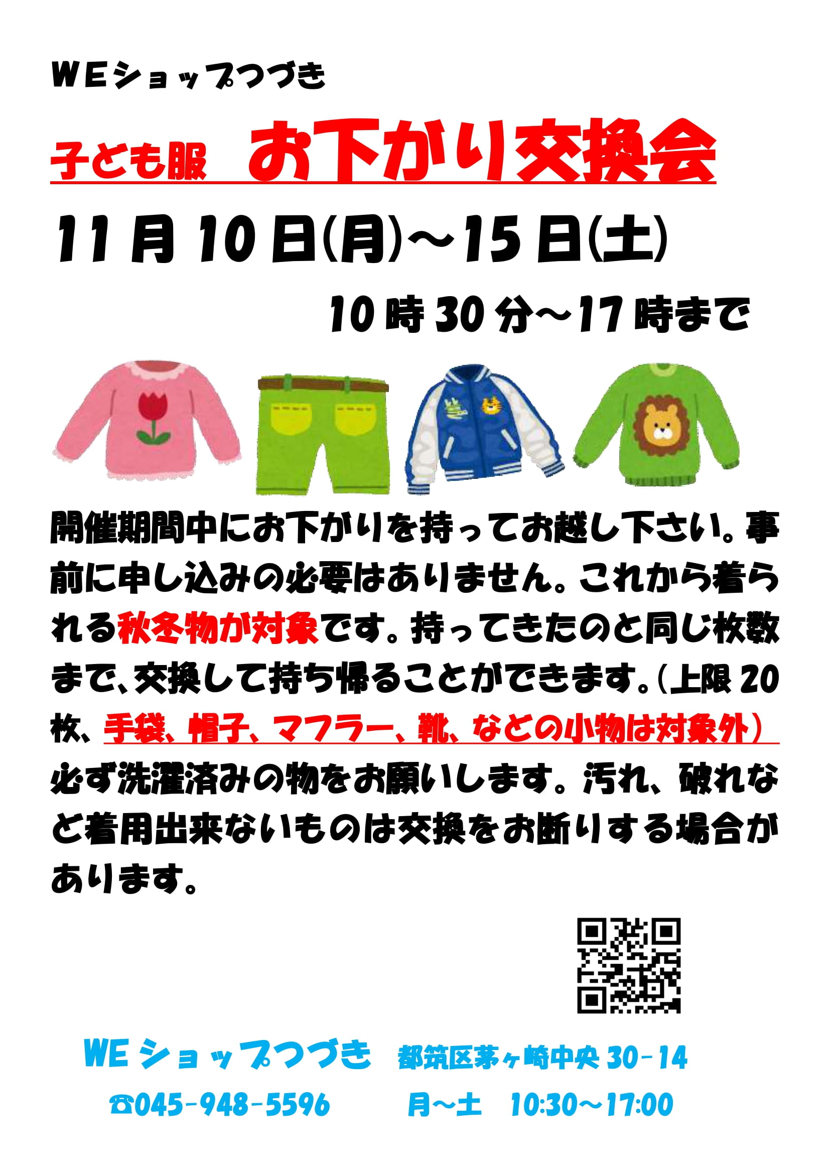 買い足す前にWEショップ つづきで開催される「子ども服お下がり交換会」でお子さんのサイズアウトした服と交換してみてはいかがでしょう。地域でリサイクルすることで、環境にもお財布にも優しくて素敵な企画ですね。