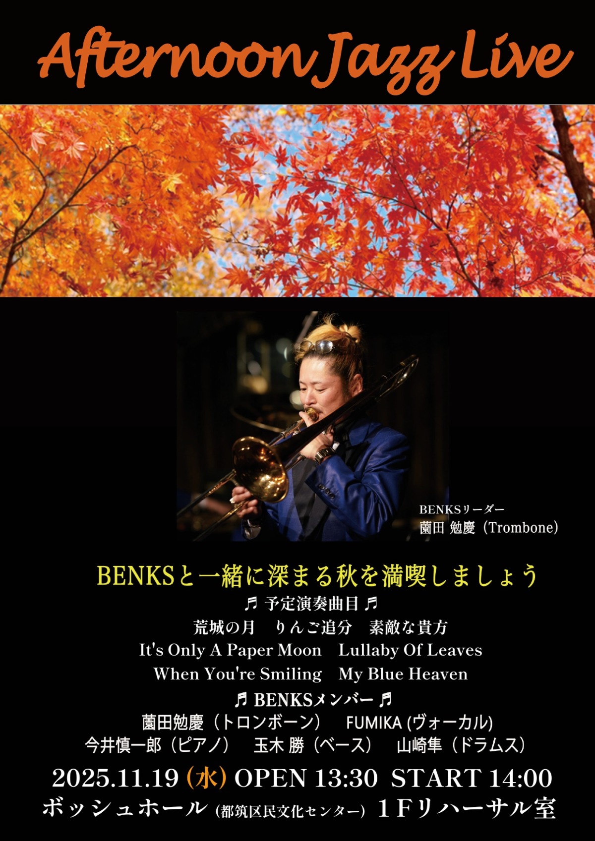 今回は、薗田勉慶(トロンボーン)率いる『BENKS』で、オーソドックスなジャズから日本の懐かしいナンバーをお送りします。