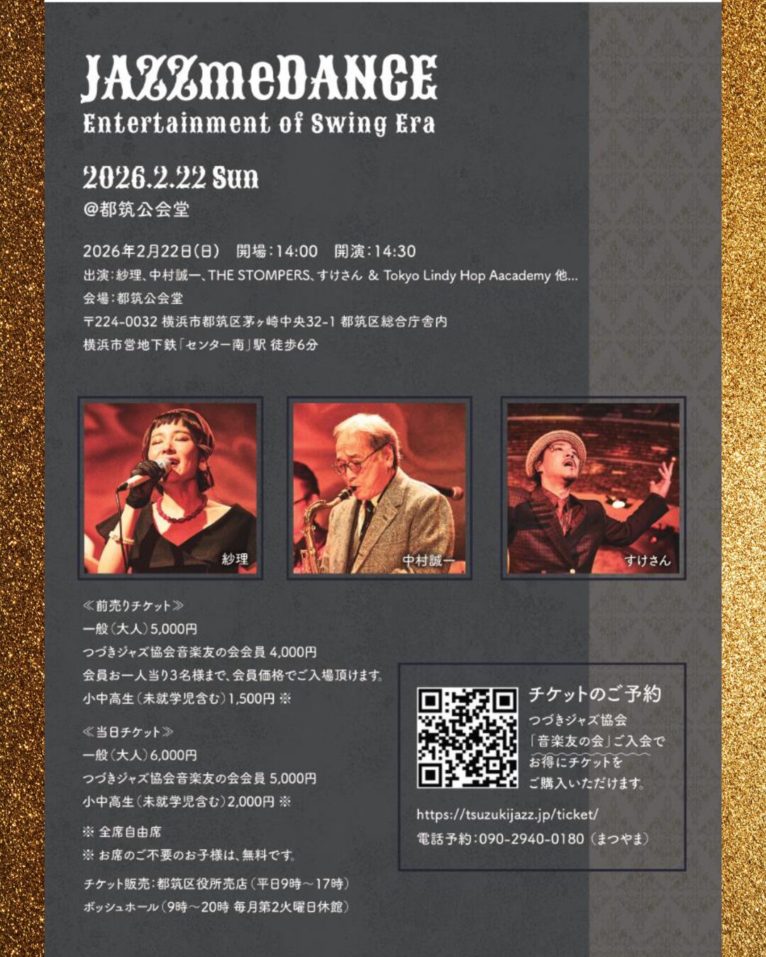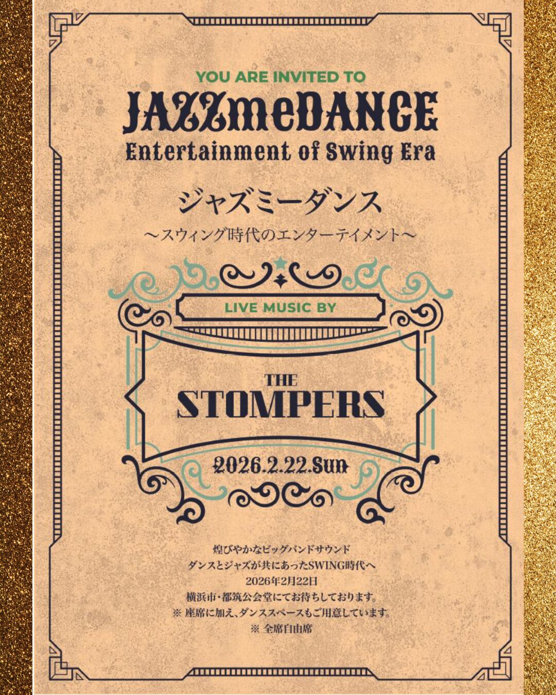 つづきジャズ協会がお贈りする2026年の最初のライブは、昨年8月に開催して大好評でした『ジャズ ミー ダンス』、紗理ジャズヴォーカル巨匠中村誠一氏率いるビックバンド『THE STOMPERS』を擁してお送りします。