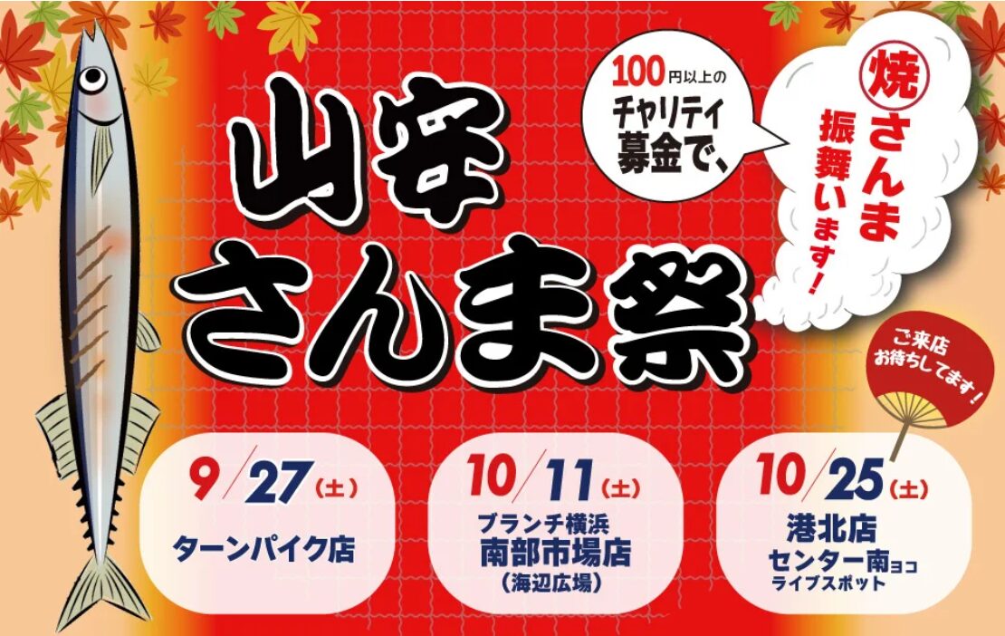 秋の恒例イベント「⼭安さんま祭り」第1弾は「⼭安ターンパイク店」で行われ、さんま2,000尾が提供されました。続く10⽉11⽇(⼟)には第2弾が「山安横浜南部市場店」で2,000尾、そして、わが街センター南は、10⽉25⽇(⼟)に第3弾として2,000尾のさんまが提供されます。