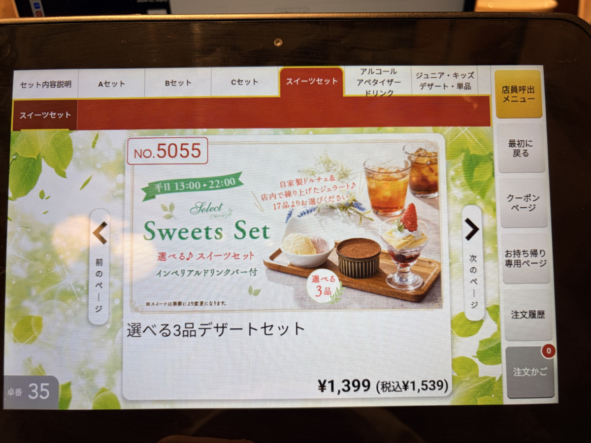 メニューはタブレットよりA・B・Cの3種類のセットから選べ、それぞれにドリンクバーが付いています。
