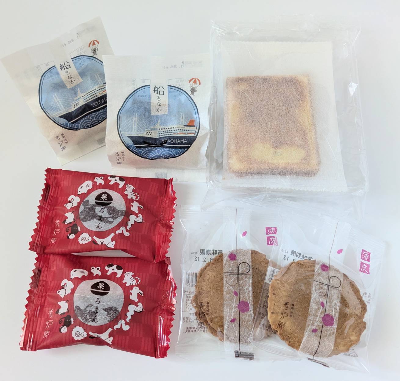 内容:栗ろまん2個・薄皮どら2個・濱煉菓4枚入1袋・船もなか2袋