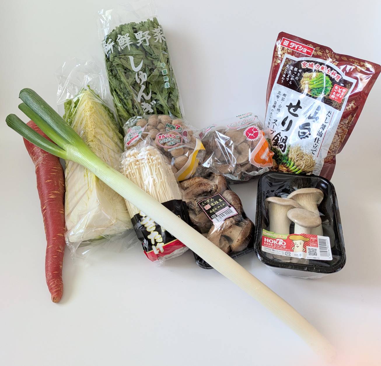 内容:きのこ5種類・ネギ・白菜・春菊・金時にんじん・鍋の素(せり鍋)