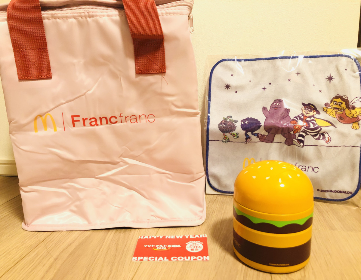 内容:フランフランのビッグな保温・保冷バッグ(全3色・いずれか1つ)・ビッグマックスープジャー・ハンドタオル(全4色・いずれか1つ)・マクドナルド商品無料券(最大合計3,910円相当)