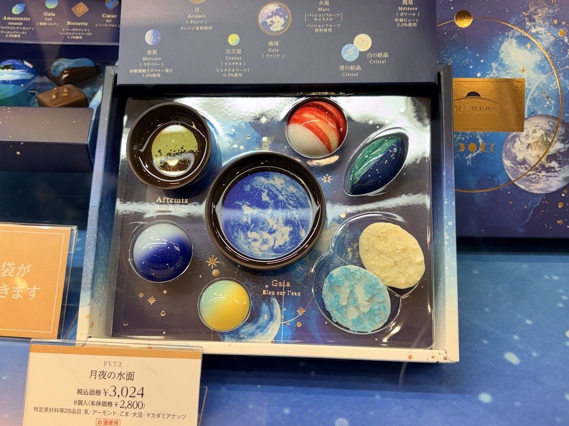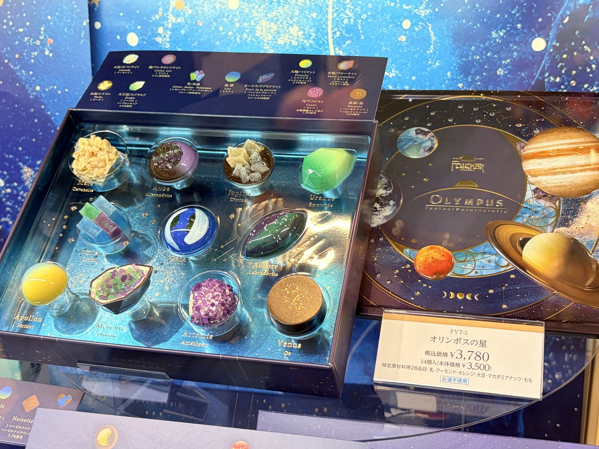 惑星や星座をモチーフにした、きらめくようなビジュアルが目を引くシリーズ。惑星ごとに味が違うアソートになっています。