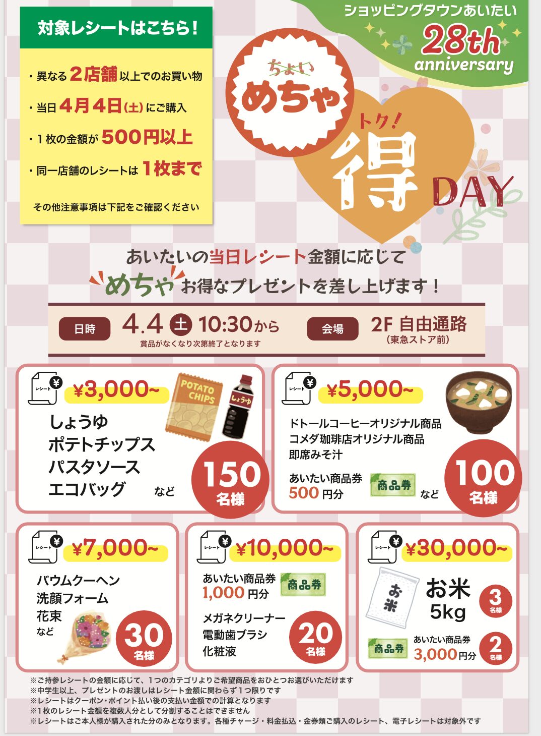 昨年も開催された「めちゃ得DAY」。あいたい館内でのお買い物レシートに応じて、嬉しいプレゼントが用意されています。