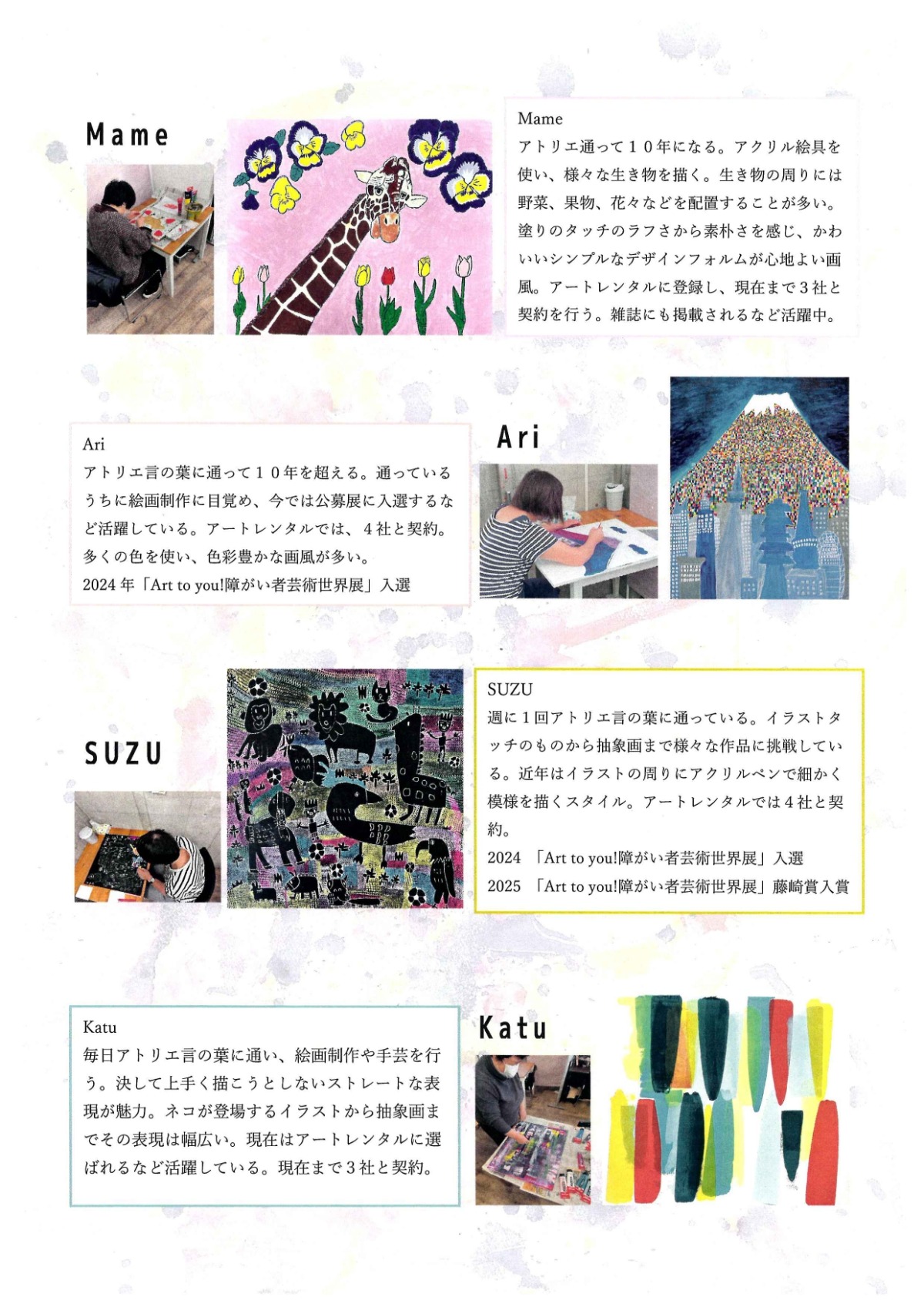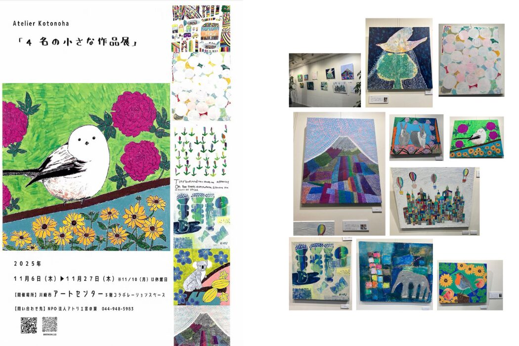 展示されているのは、宮前区の「アトリエ言の葉」のアーティスト・Mameさん、Ariさん、SUZUさん、Katuさんの作品。