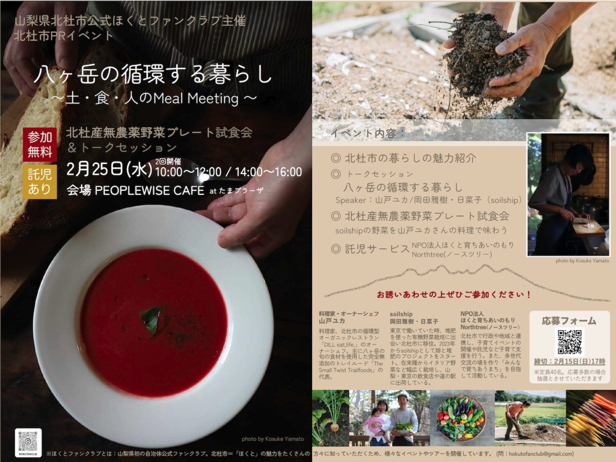 滋味溢れる料理を味わいながら、北杜市の「持続可能な暮らし」を体験するひとときをお届けします。