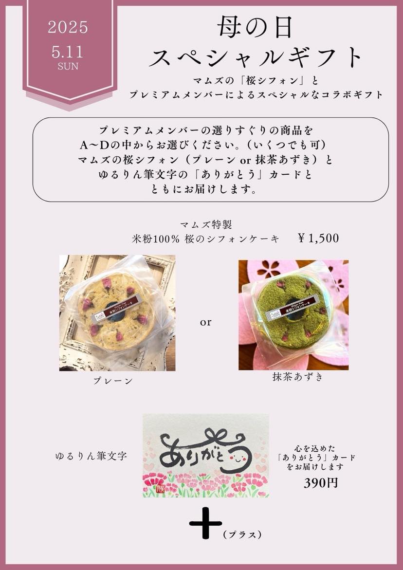 マムズダイニングオリジナルシフォンケーキ2種から選び、4種類のギフトから1つ選んでゆるりん筆文字のカードを添えて、セットで販売。