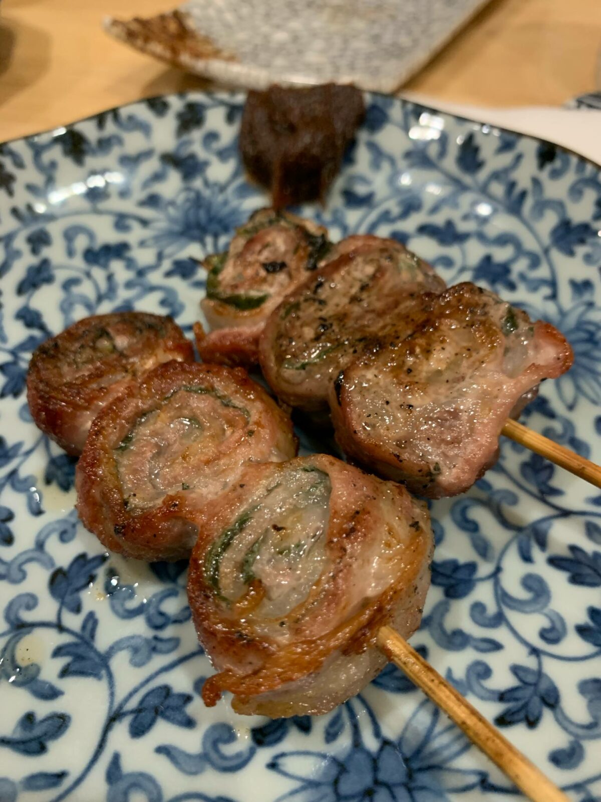 まずは、豚肉の串焼き「やきとん」を数種類、「シソ肉巻き」「ねぎ間」などを注文。