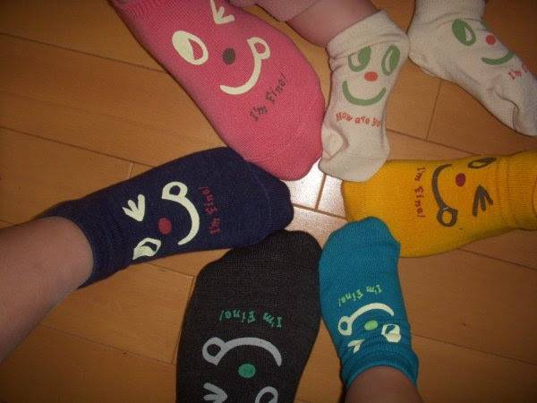 以前、お友達から色違いの靴下をいただき、家族みんなで履いたら可愛いやら嬉しいやら。
