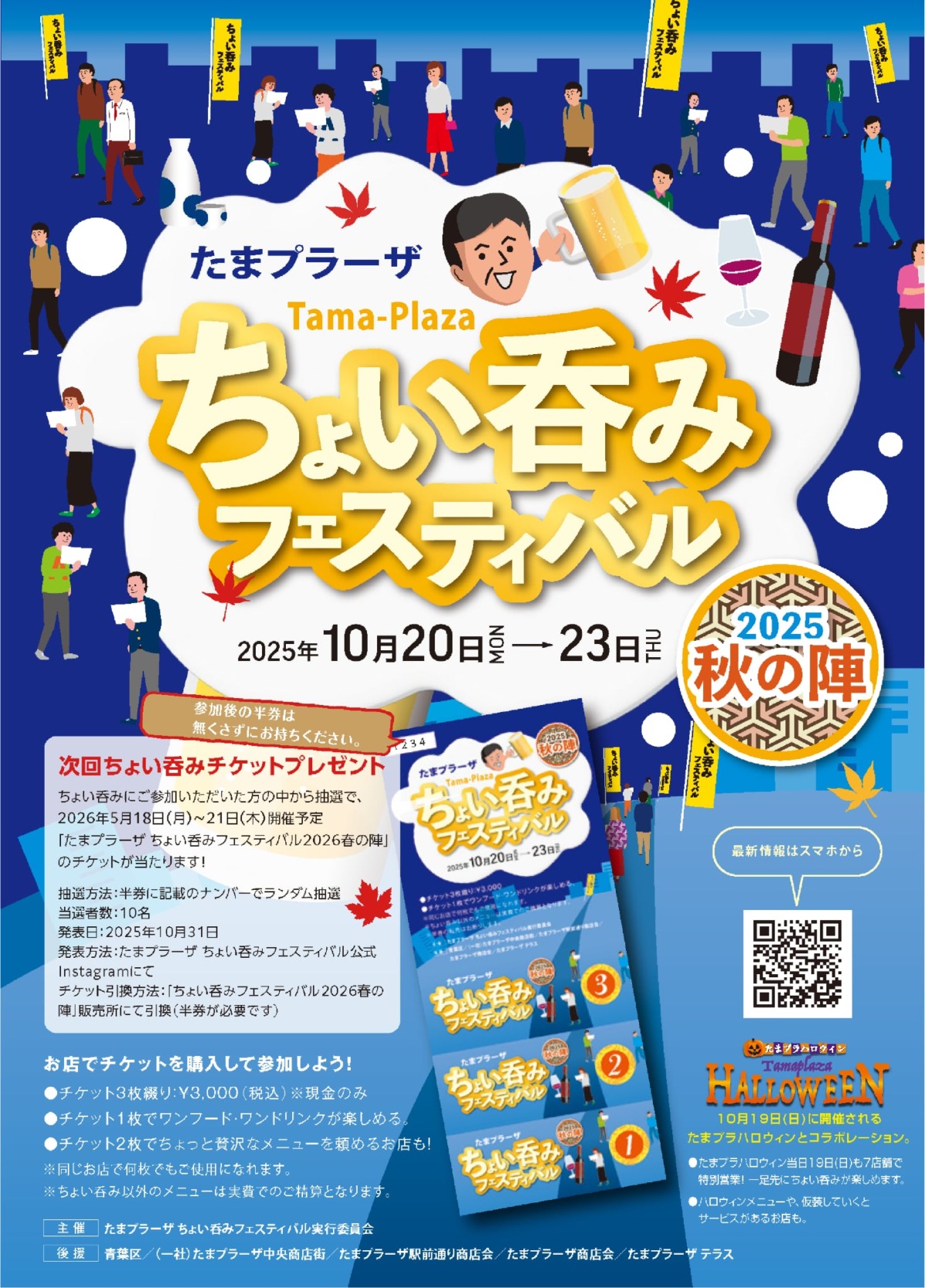 チケット購入場所:ちょい呑み参加店、たまプラーザ駅中央改札前・中央商店街 栄友堂前(いずれも当日17-20時)※たまプラーザテラス ダイニング参加店でのチケット販売はありません。