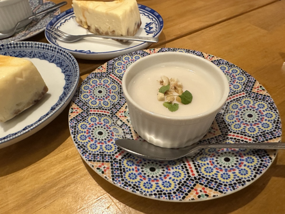 モロッコを旅して魅了されたというパティシエさんが手がけるスイーツは、異国の香りを感じつつも軽やかな味わい。ハリッサのチーズケーキは、底の塩レモンの食感が楽しく、後味すっきり。アーモンドミルクのブラマンジェも上品な甘さで、食後にぴったりでした。