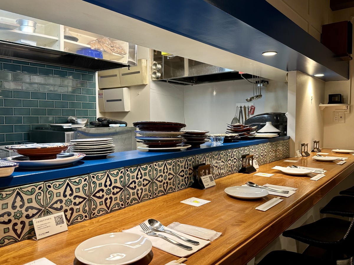 販売もしているという、モロッコの食器が並んだ棚は楽しさいっぱい。ヨーロッパとアラブが融合したエキゾチックな雰囲気のモロッコを感じられます。座席はカウンター席、2人席、4人席の他、6席の半小部屋があり、どんな人数で行ってもよさそうです。