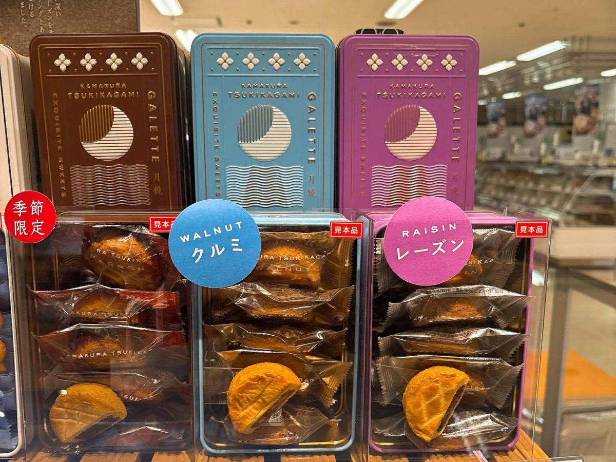 鎌倉ニュージャーマンは、おしゃれな缶入り商品も魅力のひとつ。中でもおすすめなのが、キャラメルフィリングをやわらかいクッキー生地で包んだガレット「月鏡(つきかがみ)」です。