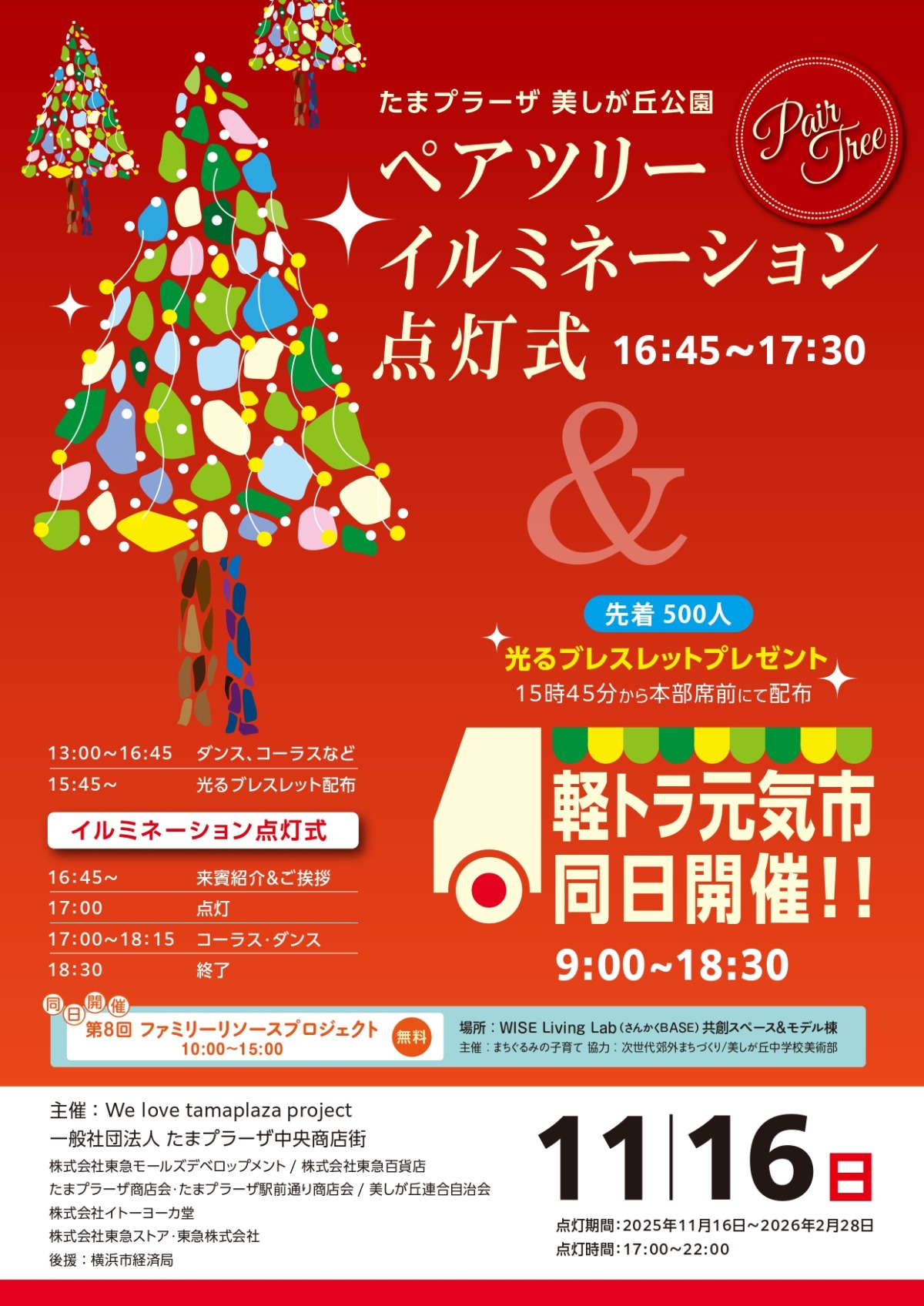 軽トラ元気市は9:00から、ステージイベントは13:00から開催されます。15:45からは、本部席にて先着500名の方に点灯式で使用する光るブレスレットのプレゼントがありますので、ぜひこちらもお見逃しなく!